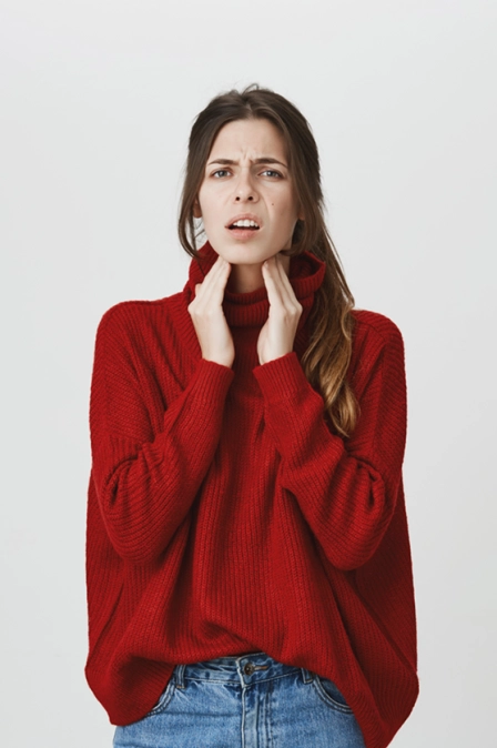 - Появляется ощущение комка в горле, иногда — затруднение дыхания.